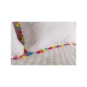 Confeccionada con cinta perimetral a tono con la colcha y además las esquinas inferiores están redondeadas.