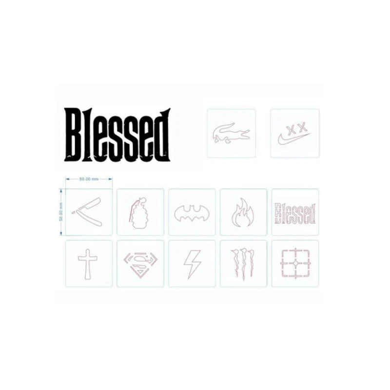 ¡Lleva tus diseños de hair tattoo al siguiente nivel con las plantillas de la marca de moda «Blessed»! Con estas 12 plantillas de 50 mm podrás realizar increíbles tatuajes en el cabello de forma rápida, precisa y profesional.