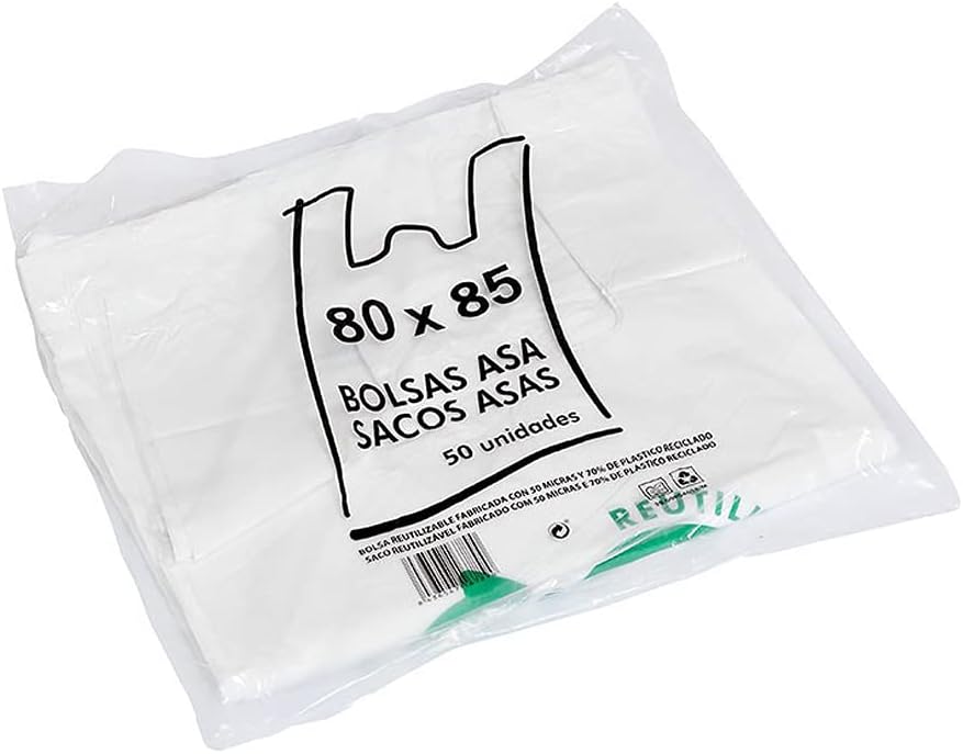 50u Bolsas De Plástico Reciclado, Resistentes, Reutilizables de Galga 200, Cumple Normativas, Aptas Uso Alimentario (80x85cm)
