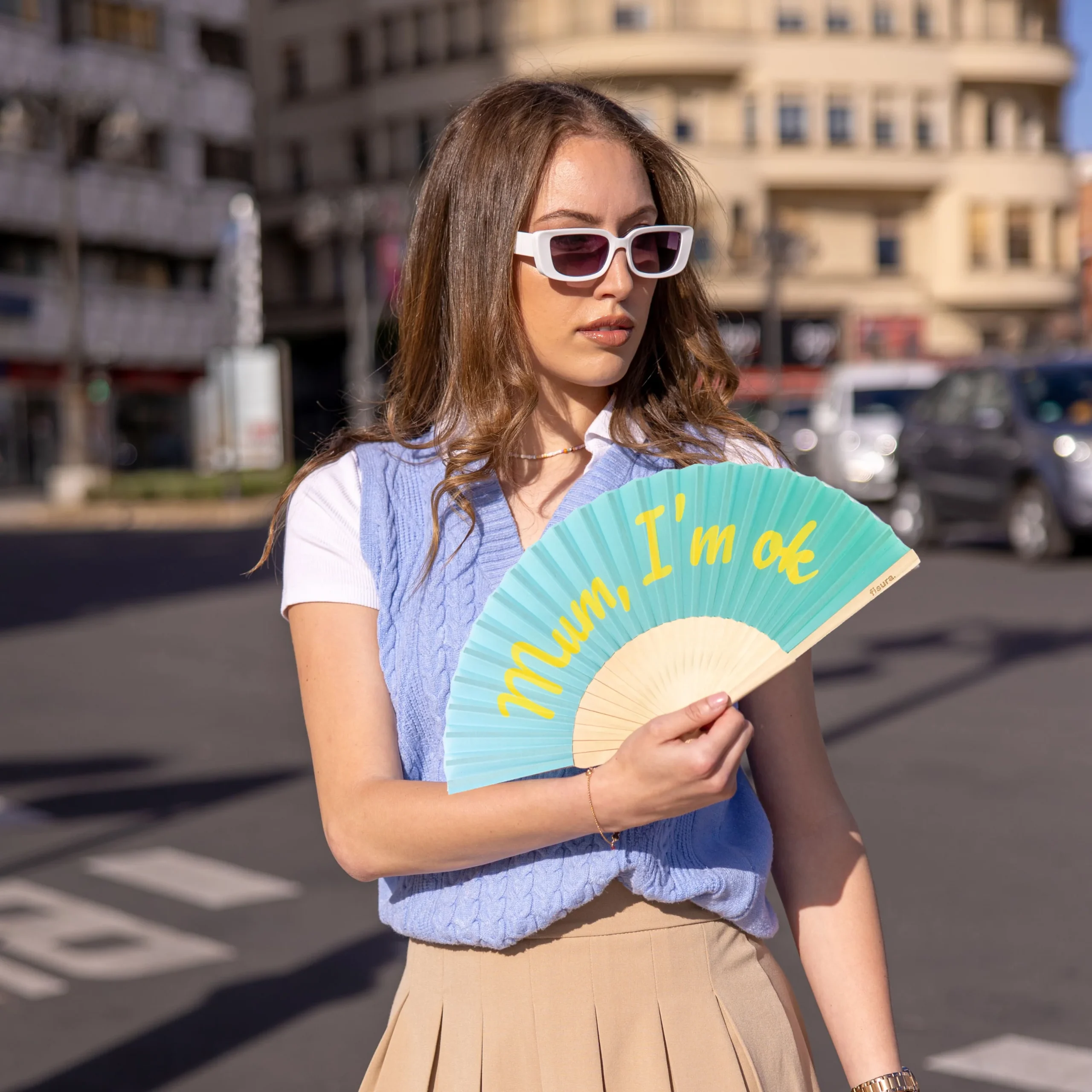 Refréscate y disfruta al máximo con este abanico original en tonos azules y amarillos que le dará a tus “looks” un toque de color. Con su mensaje “Mum I’m ok” es el accesorio de verano perfecto para tus aventuras 🎉. ¡Lleva contigo este abanico con mensaje y hazte una foto con él para que tu madre vea que estás pasándolo en grande!