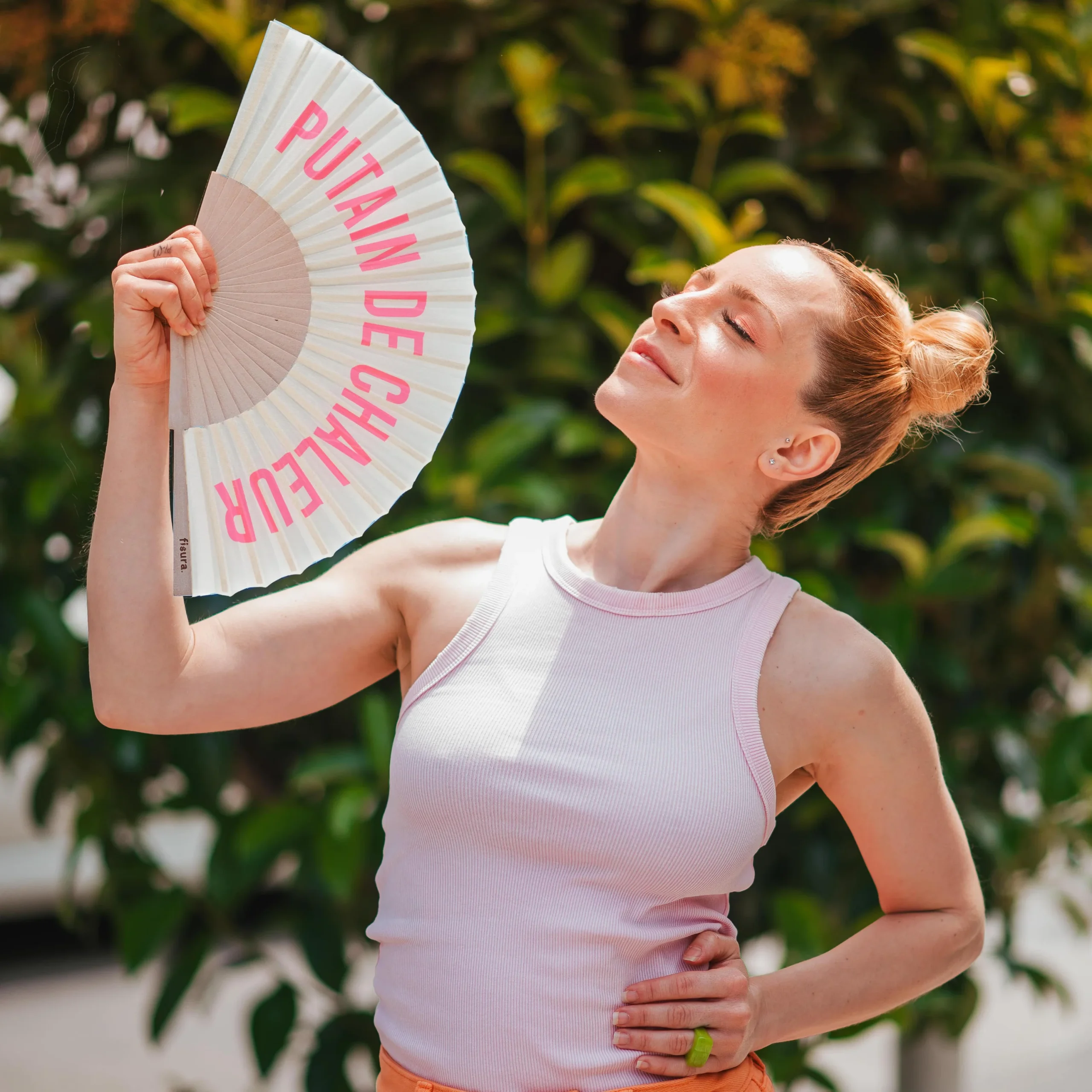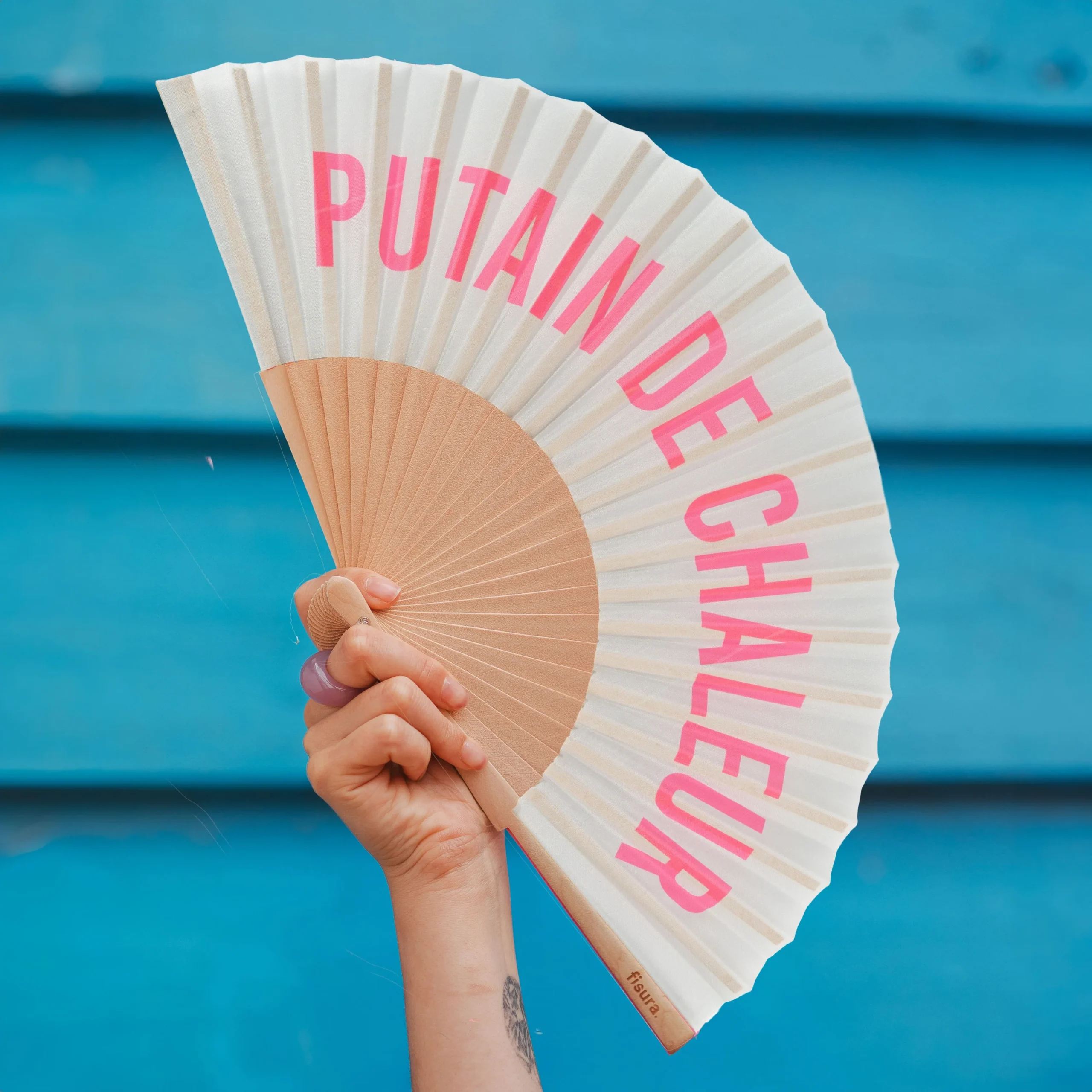 Con sus tonos gris y rosa el abanico con mensaje “putain de chaleur” es ideal para darle a tus “outfits” veraniegos un toque de diversión y seguridad en ti mism@. Además, incluye un práctico colgador para que puedas tenerlo siempre a mano y que no se te pierda ni se te olvide. ¡Cuélgatelo y olvídate de rebuscarlo en tu bolso o mochila 🎒 cuando necesites abanicarte!