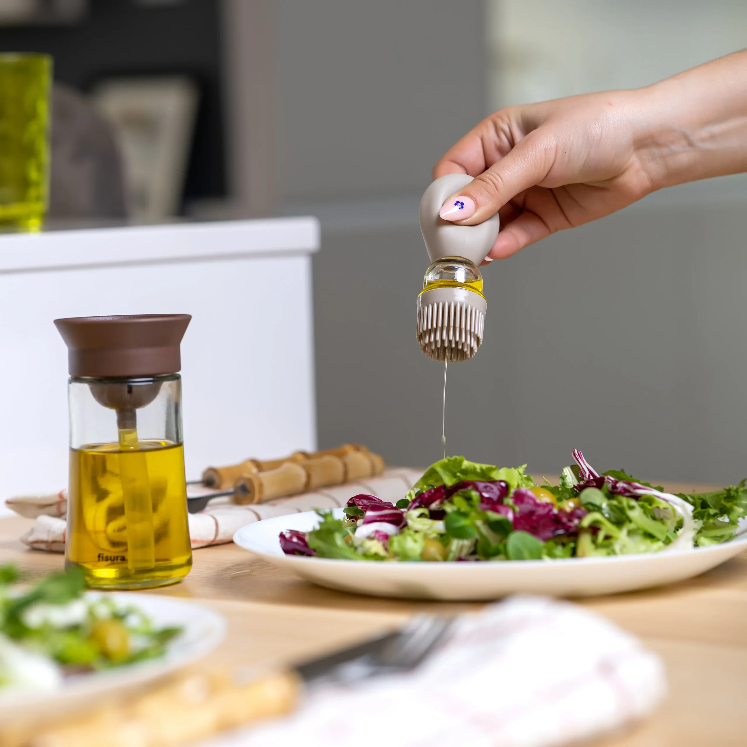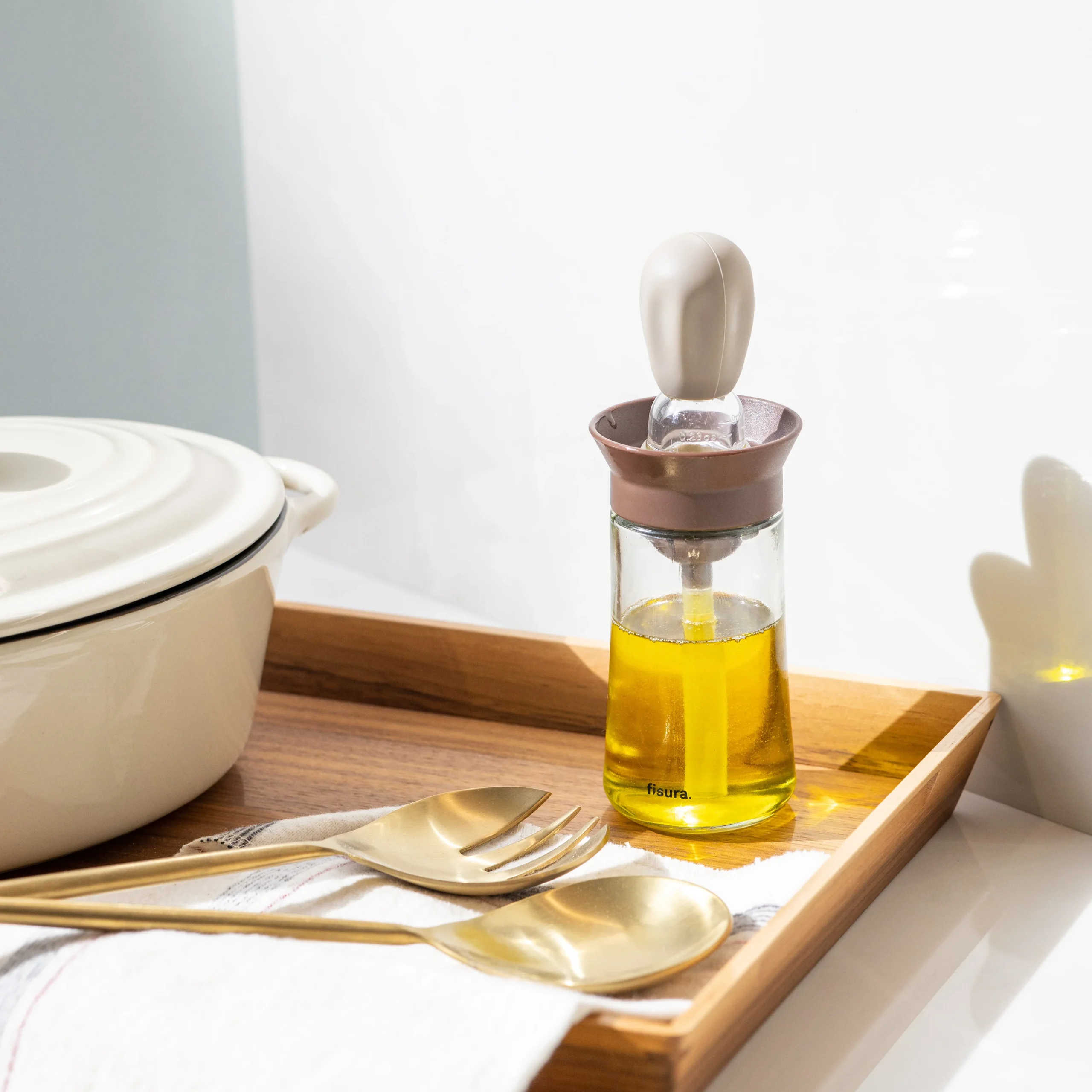 Controla la cantidad de aceite que usas en tus recetas con este dispensador de aceite. Gracias su cepillo de silicona puedes aplicarlo en la sartén o en tus carnes, pescados y platos más dulces. 🍳🥞