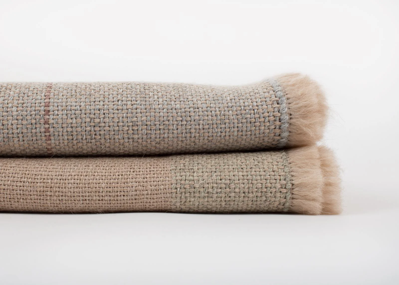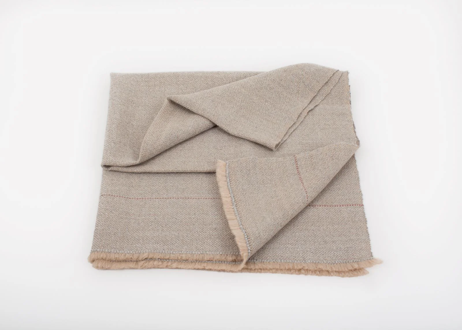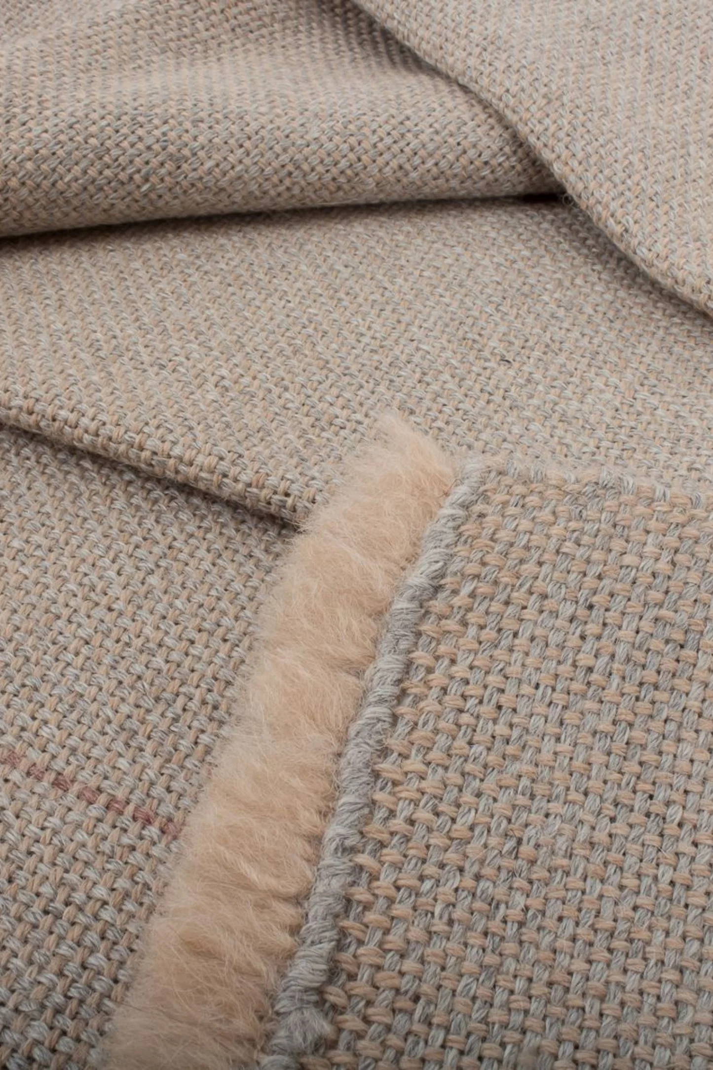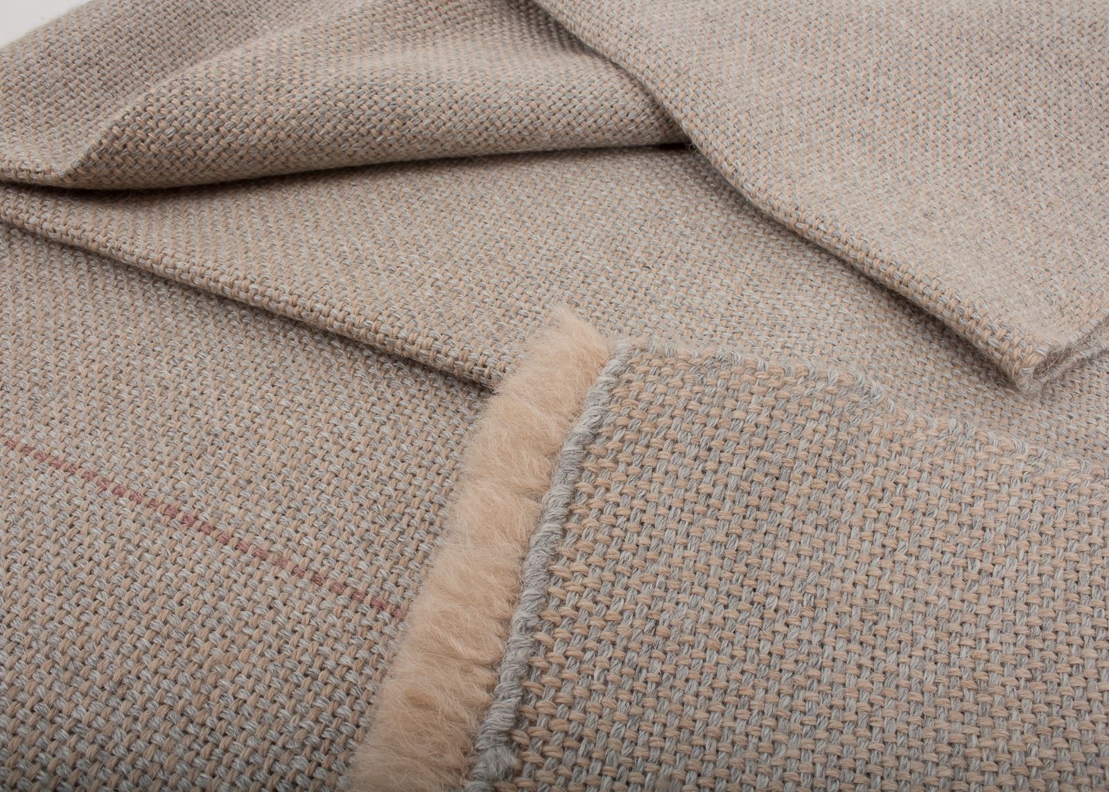 Pieza única con urdimbre de alpaca nuez tostada y trama de alpaca gris niebla. Decorada con una raya fina en color rosa salmón.