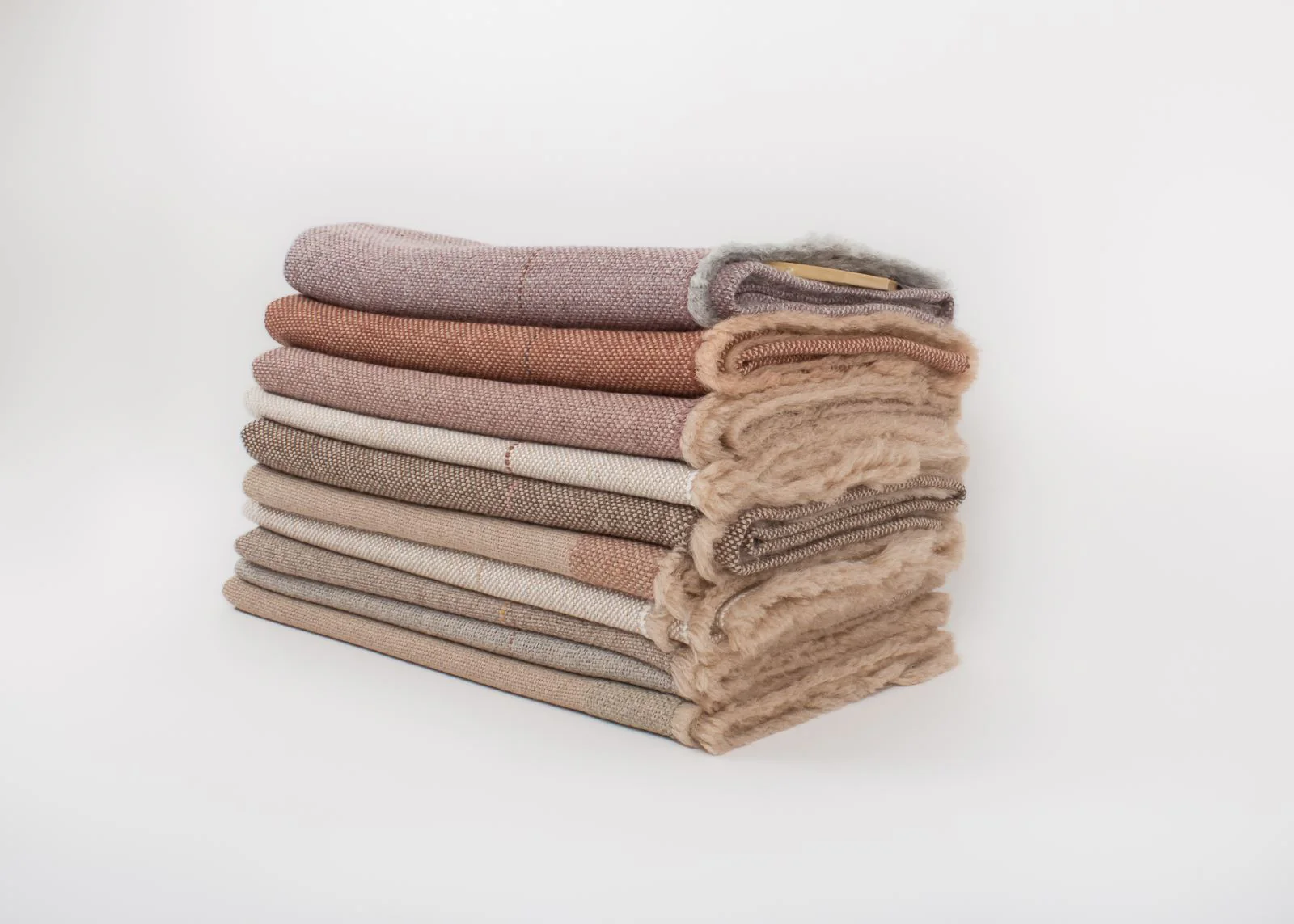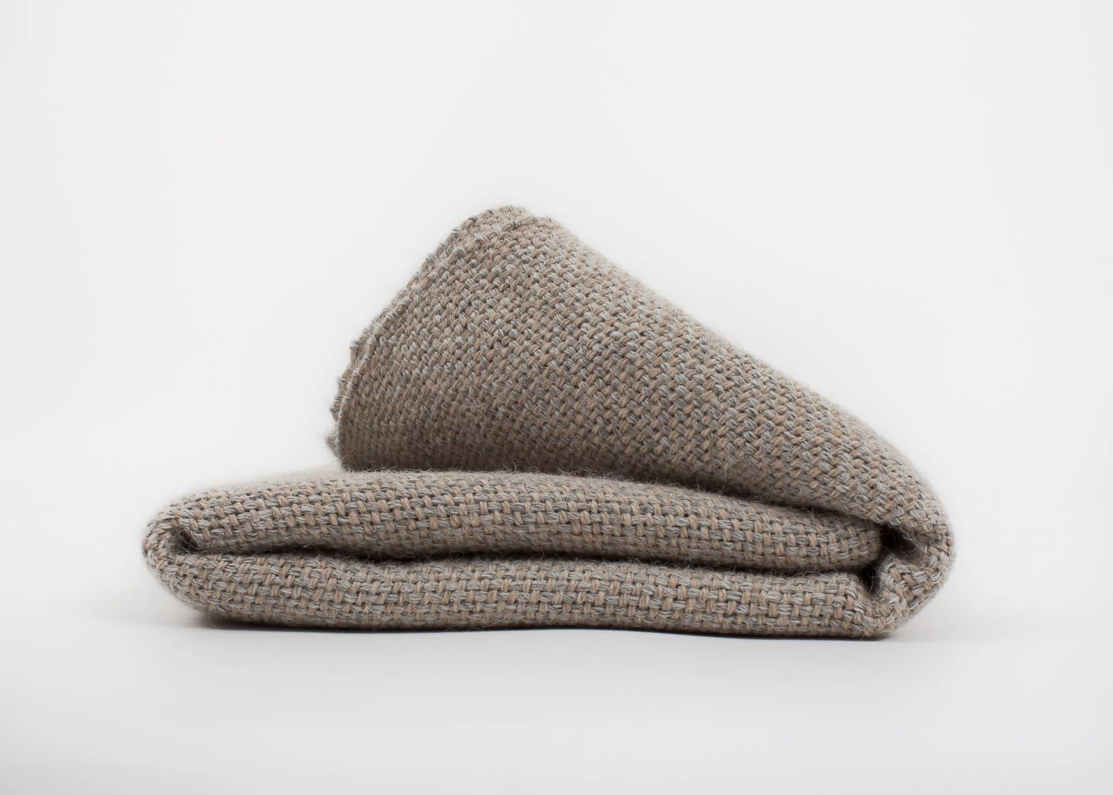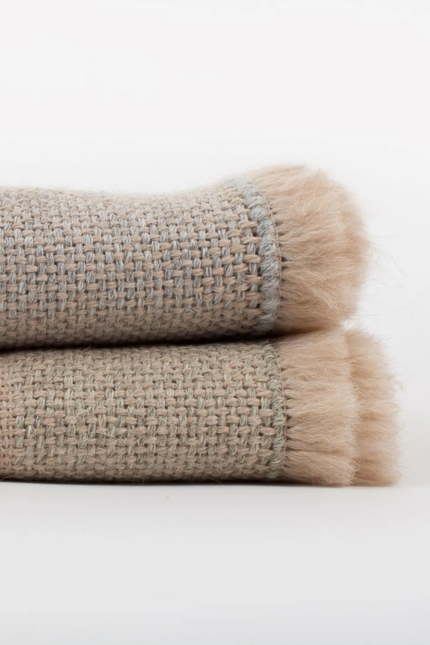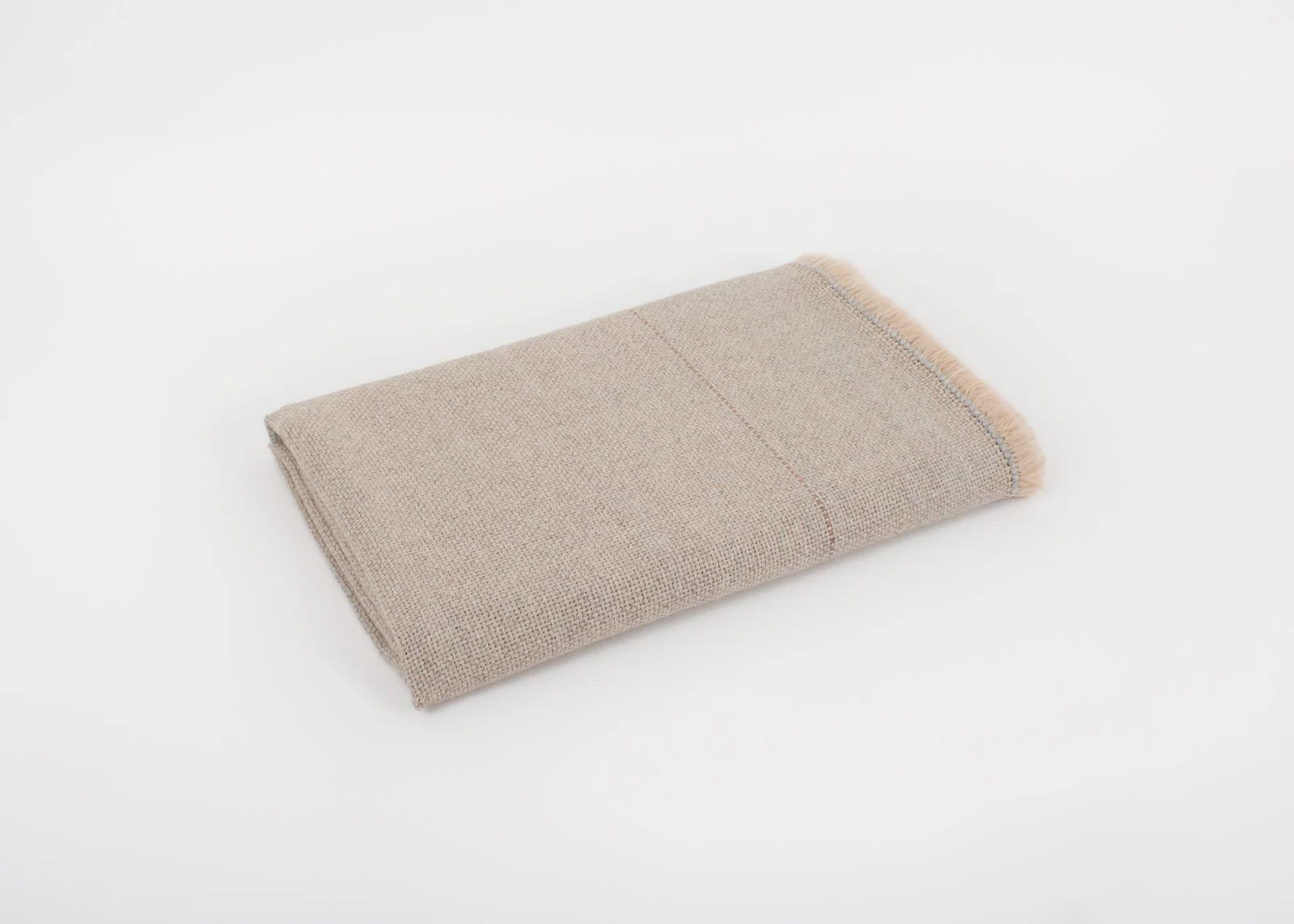 Pieza única con urdimbre de alpaca nuez tostada y trama de alpaca gris niebla. Decorada con una raya fina en color rosa salmón.