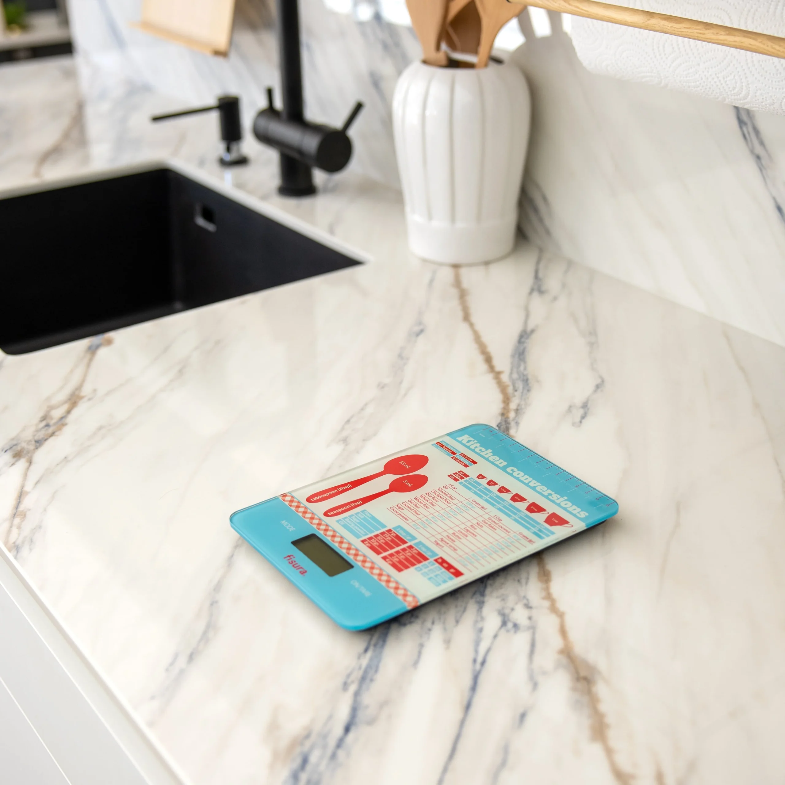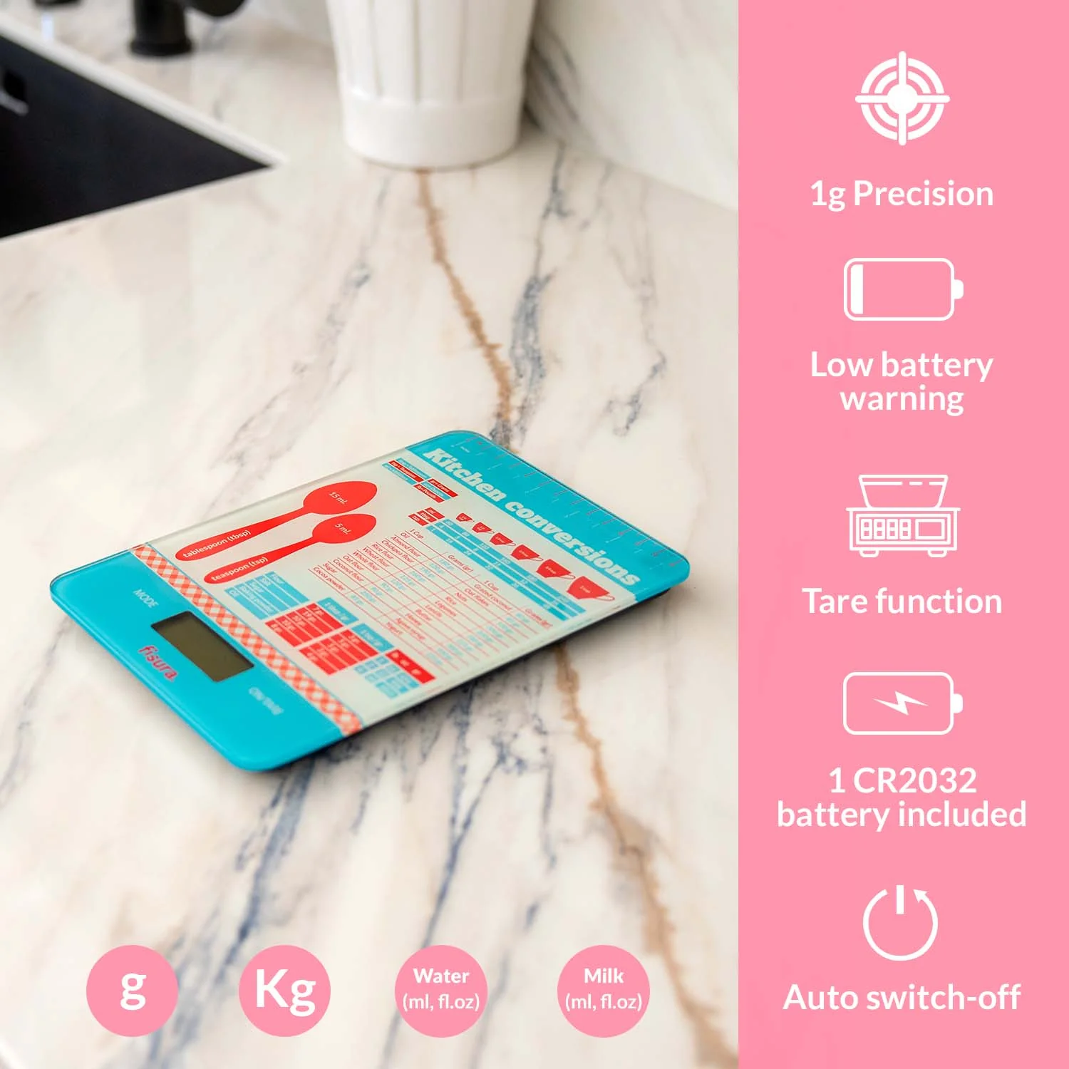 Con su estampado de equivalencia de medidas con esta báscula de cocina original podrás convertir tus recetas medidas en tazas o cucharas a gramos. Despídete de los fallos en las cantidades y conviértete en un auténtico chef 👨🍳. ¡Dejarás boquiabierto a tus invitados!