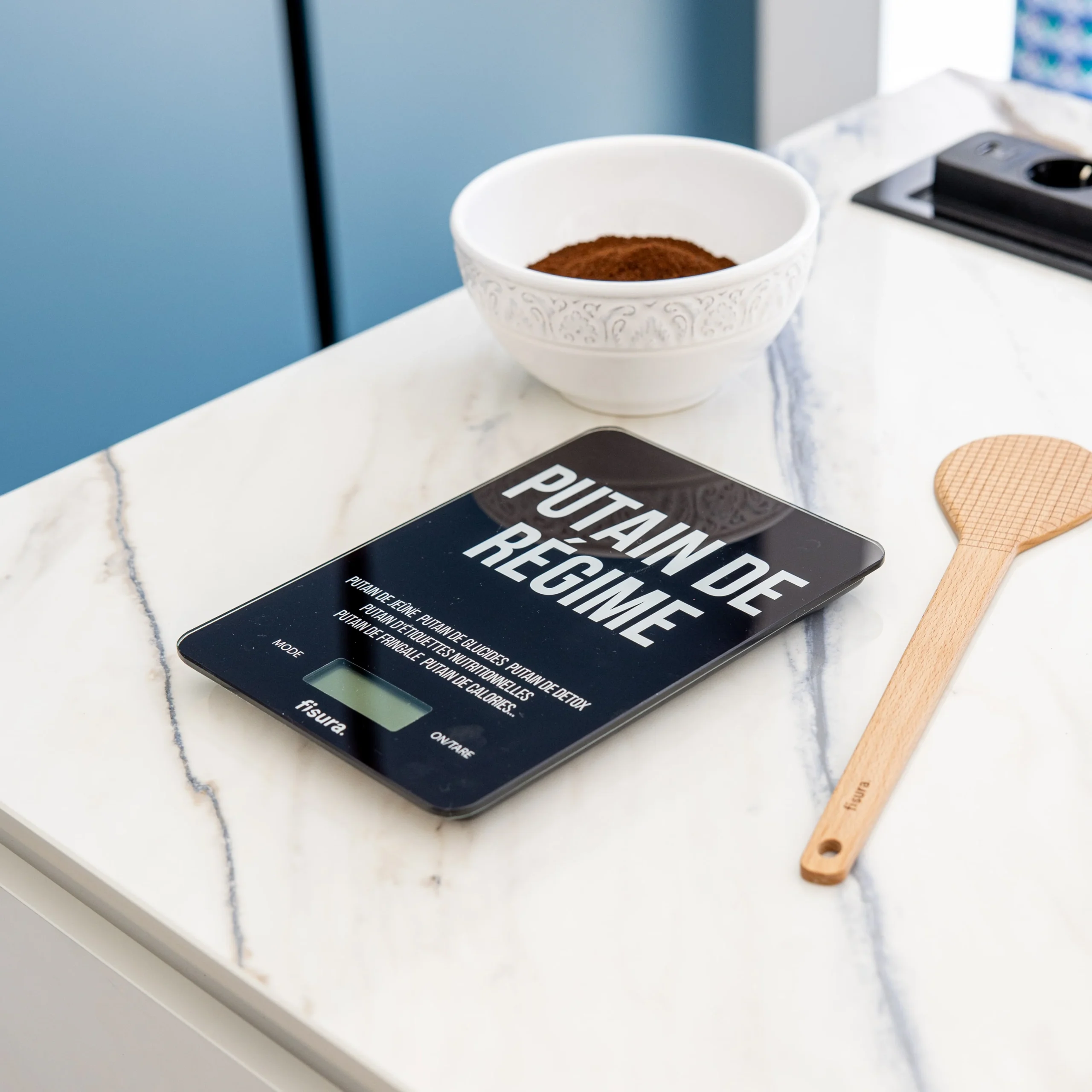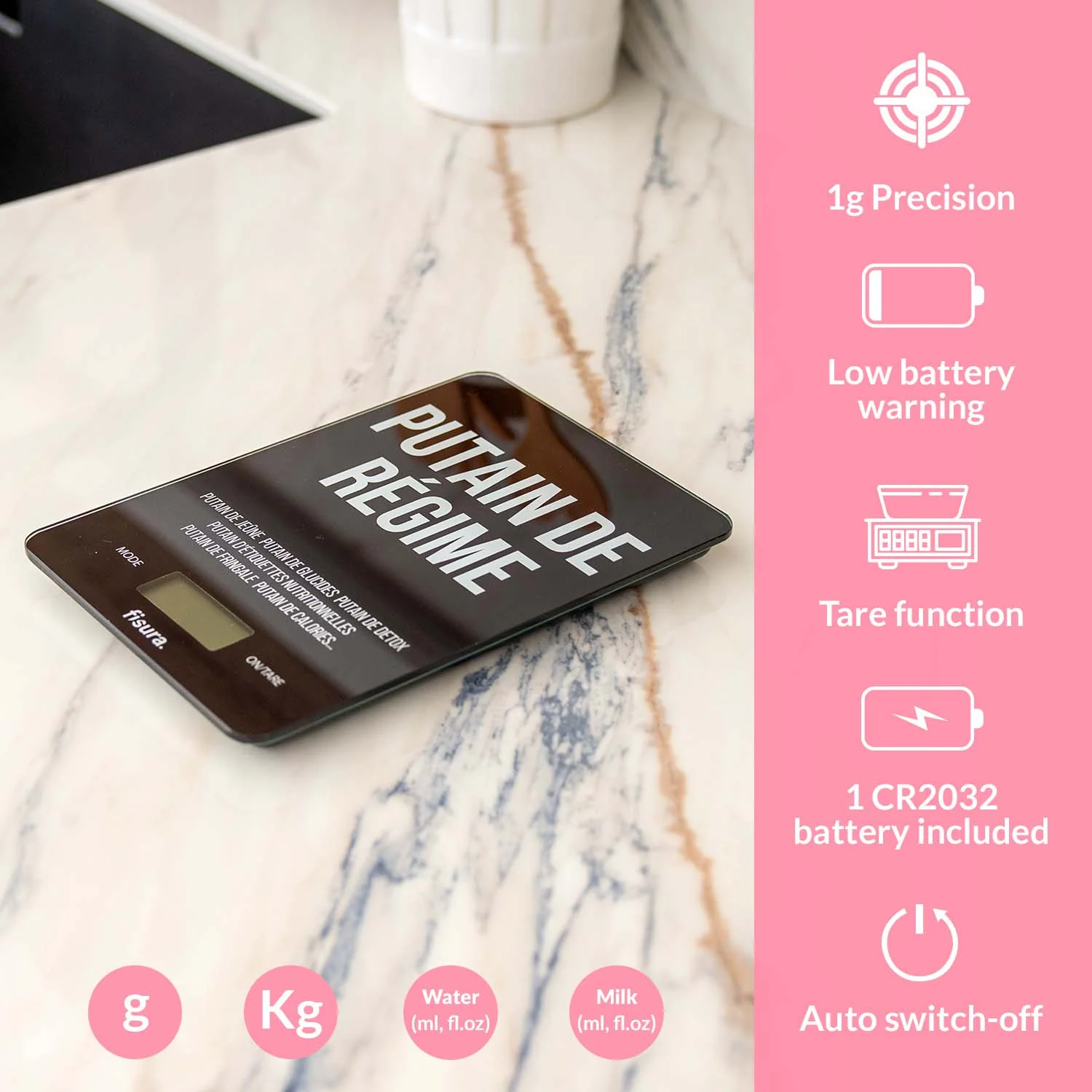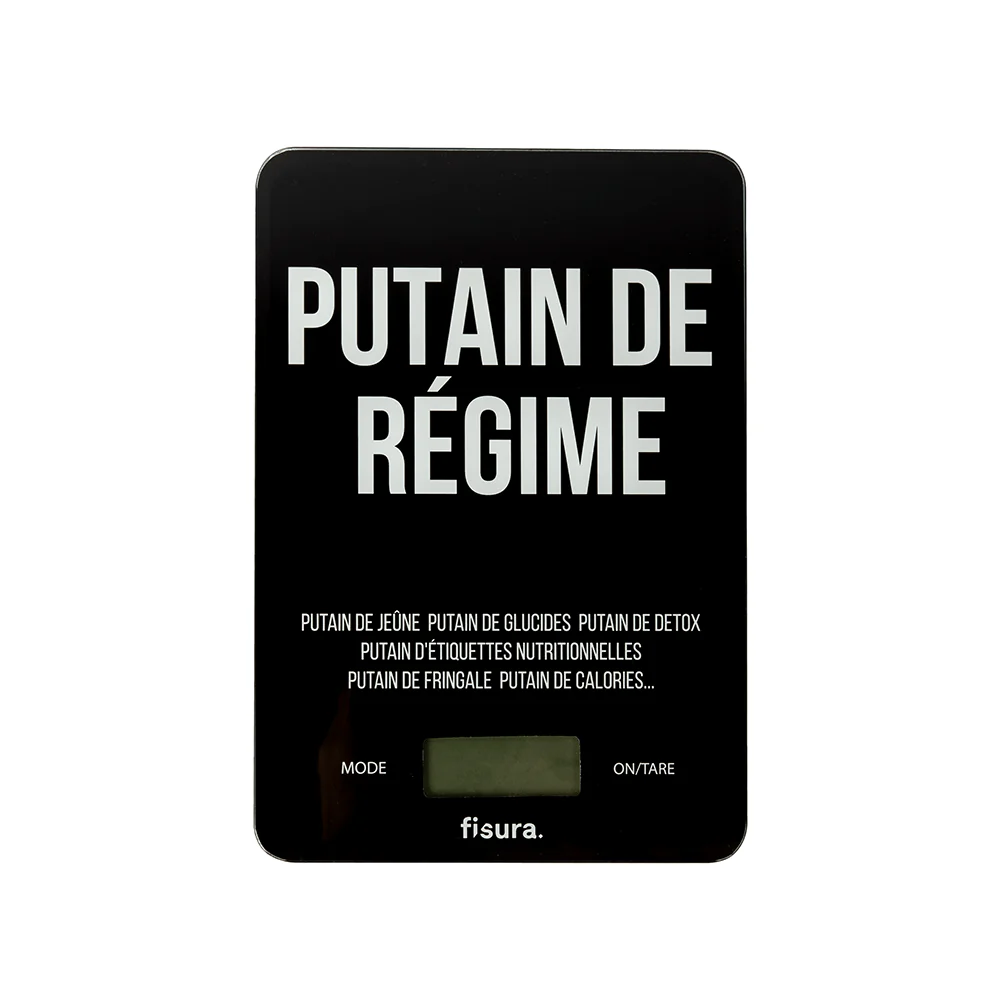 ¿Estas harto de la contar las kcal y de controlar todo lo que comes? Esta báscula de cocina original te entiende a la perfección y refleja tu “mood” con el mensaje “putain de régime”. Pero no te desanimes, ¡sigue el camino hacia una vida equilibrada con un toque canalla!