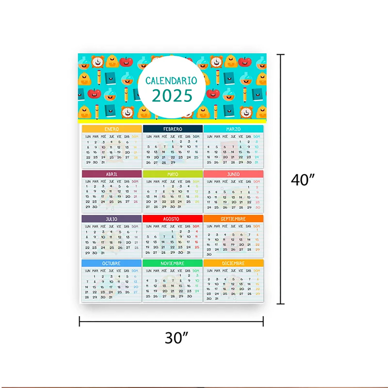 Calendario 2025 personalizado gigante de 30×40 pulgadas, para destacar tu marca durante todo el año. Impresión a color en foldcote 18.