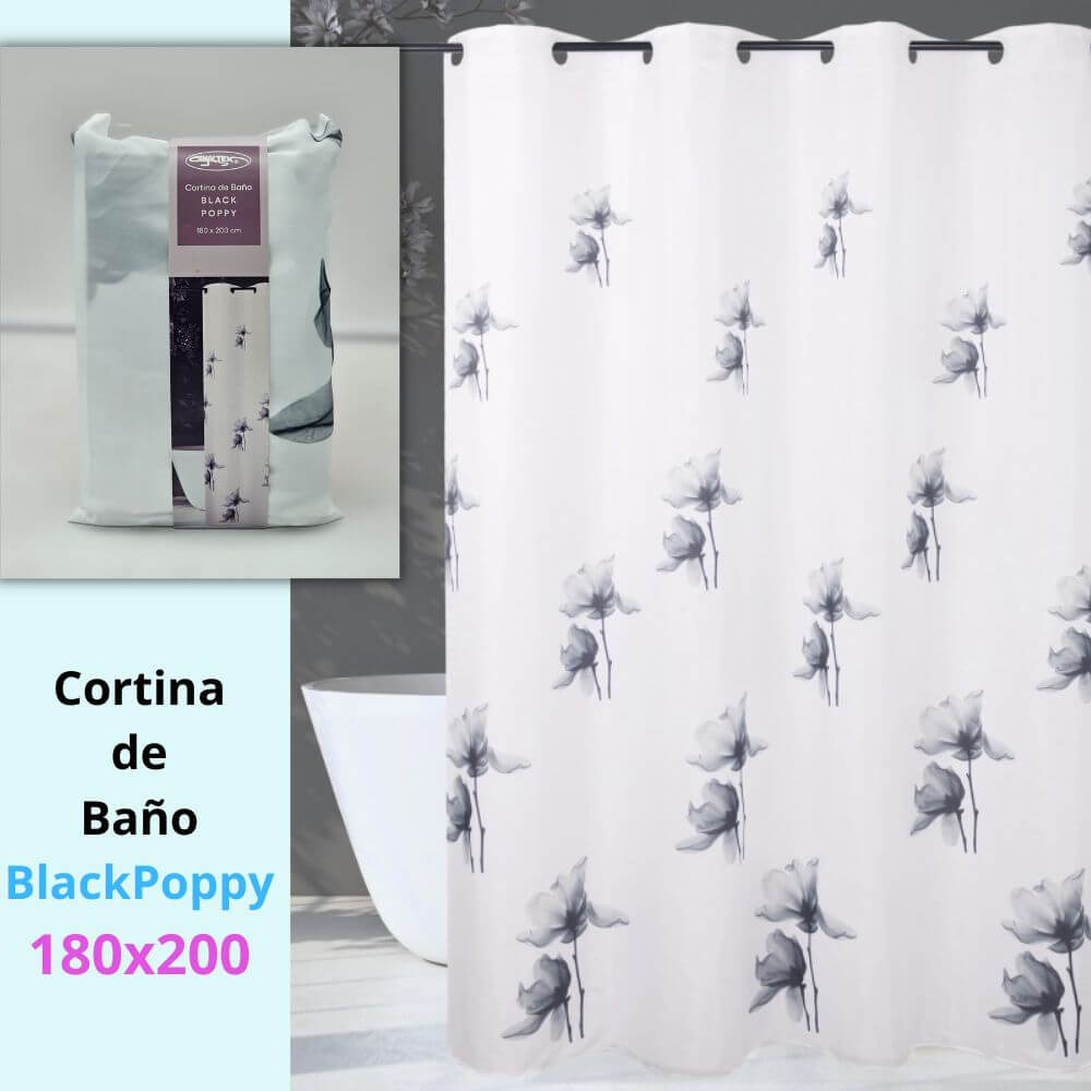 CORTINA DE BAÑO ESTAMPADA «BLACK POPPY» PARA DUCHA O BAÑERA