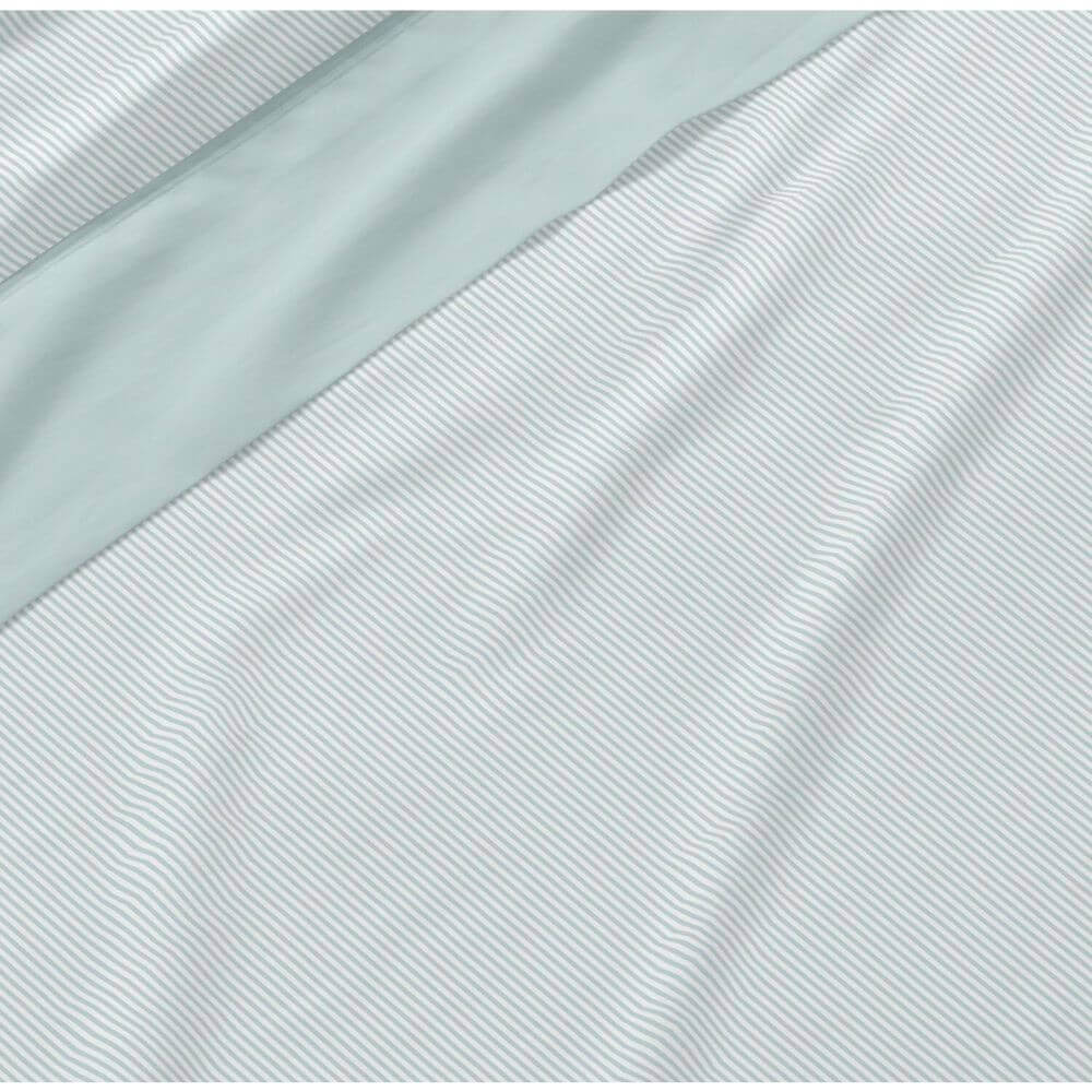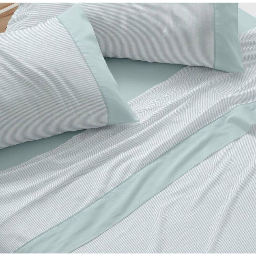 PRODUCTO: Juego de sábanas con un estampado de rayitas en tono verde y blanco. La sábana encimera y las bocas de la almohada, muestran un embozo confeccionado por una aplicación verde y ribete verde más intenso. Bajera ajustable verde.