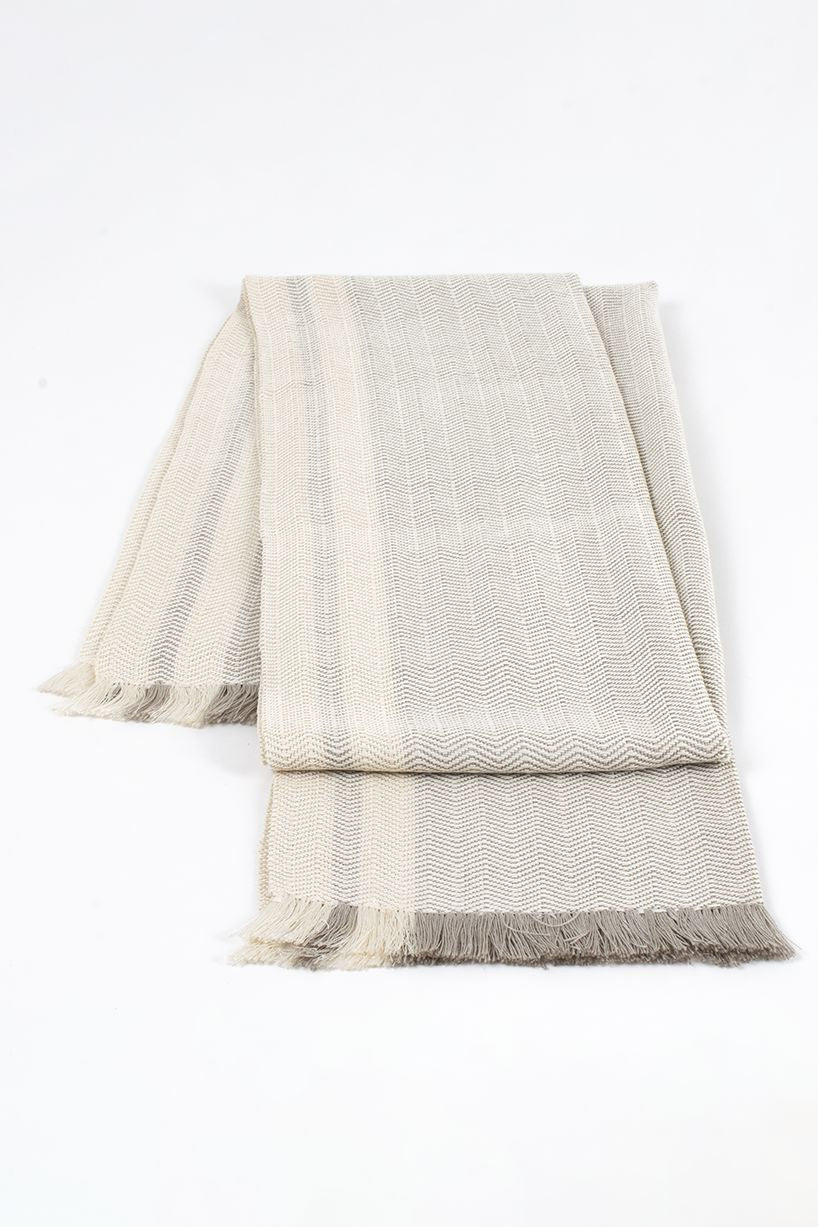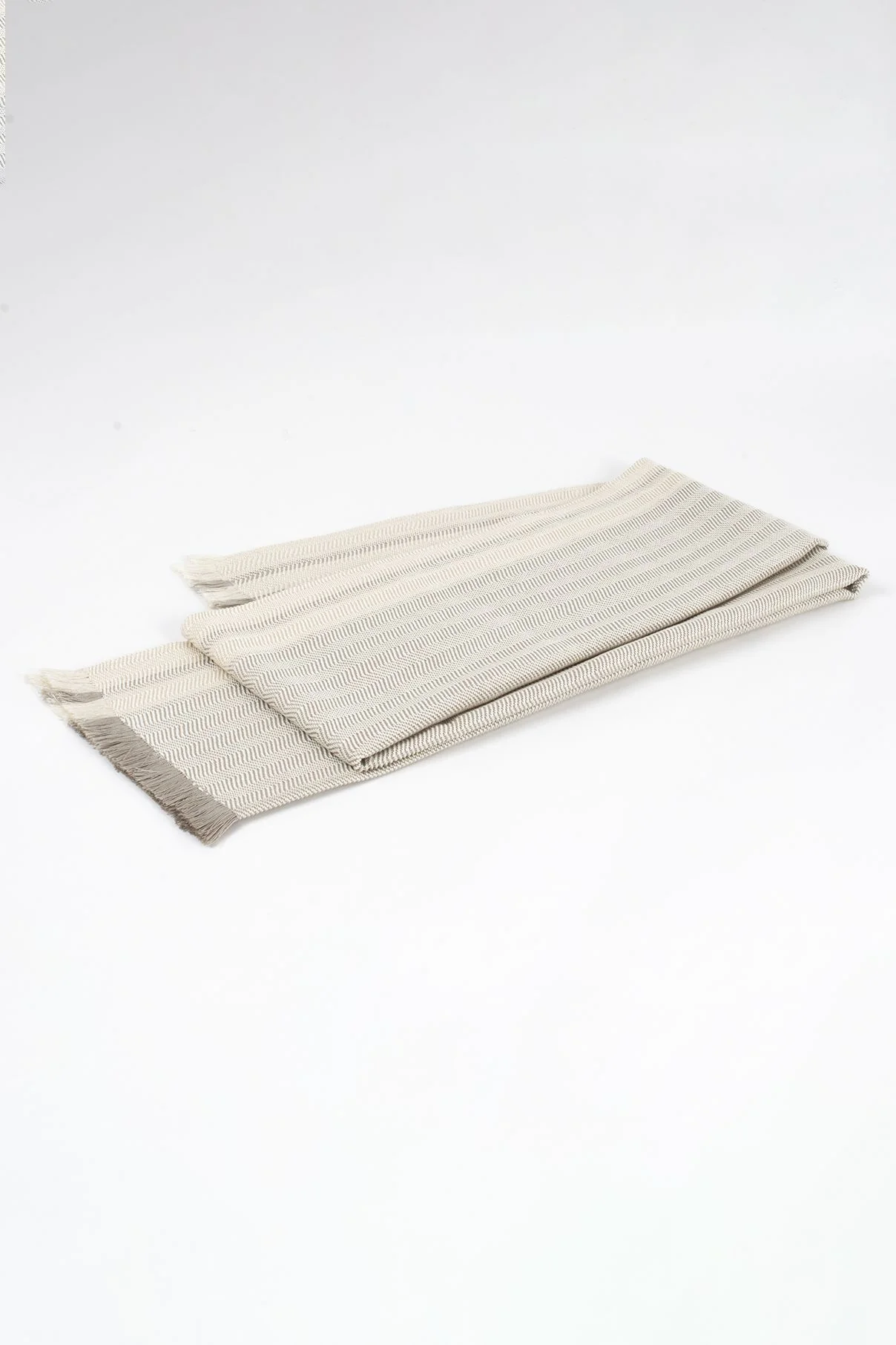 Pieza elaborada de manera artesanal, con fibras naturales de primera calidad. Con urdimbre en seda color gris perlado y trama en seda blanca. Con franjas blancas en los laterales.
