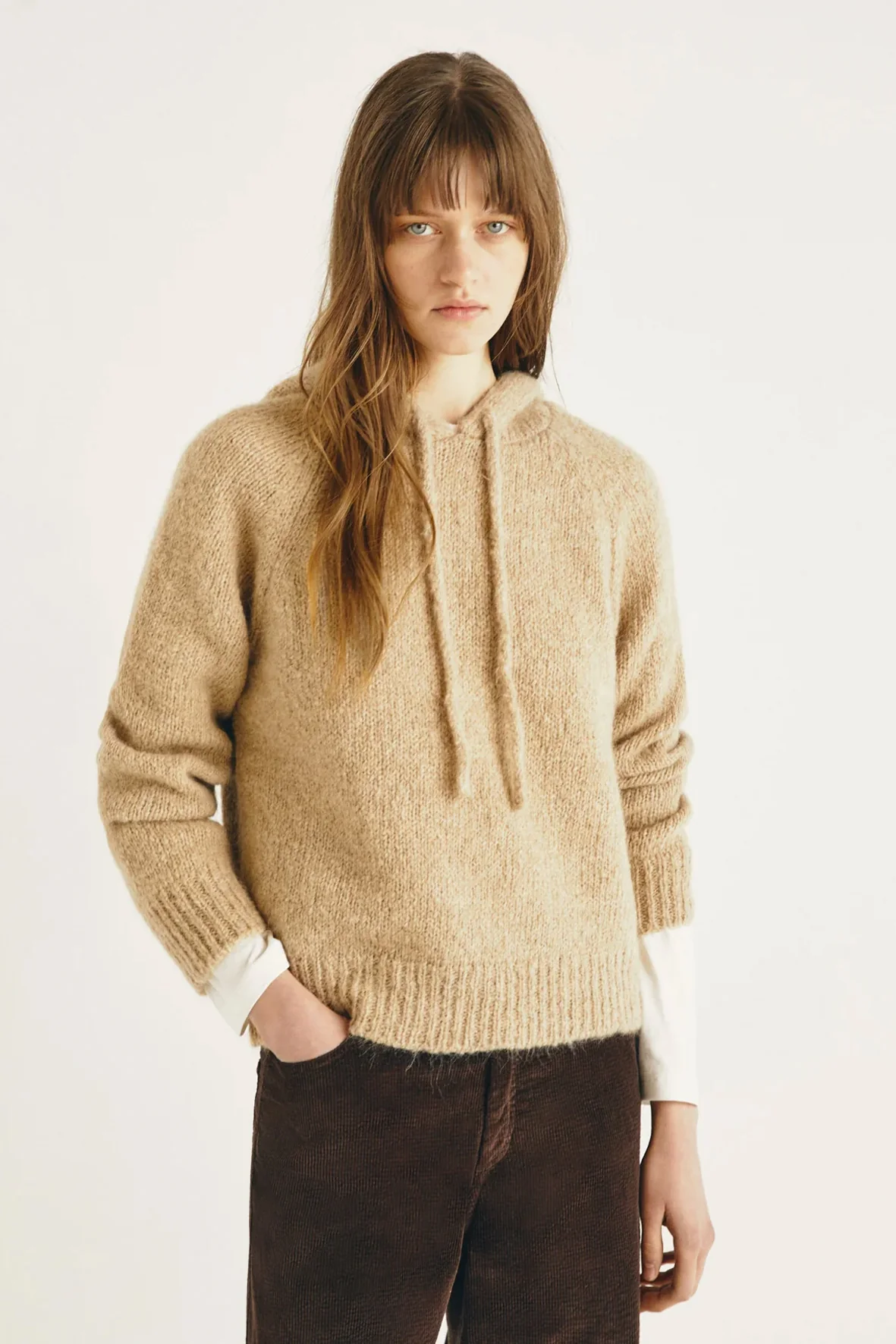 Jersey manga larga, cuello con capucha, corte regular, largo habitual. Puños y bajo acanalados