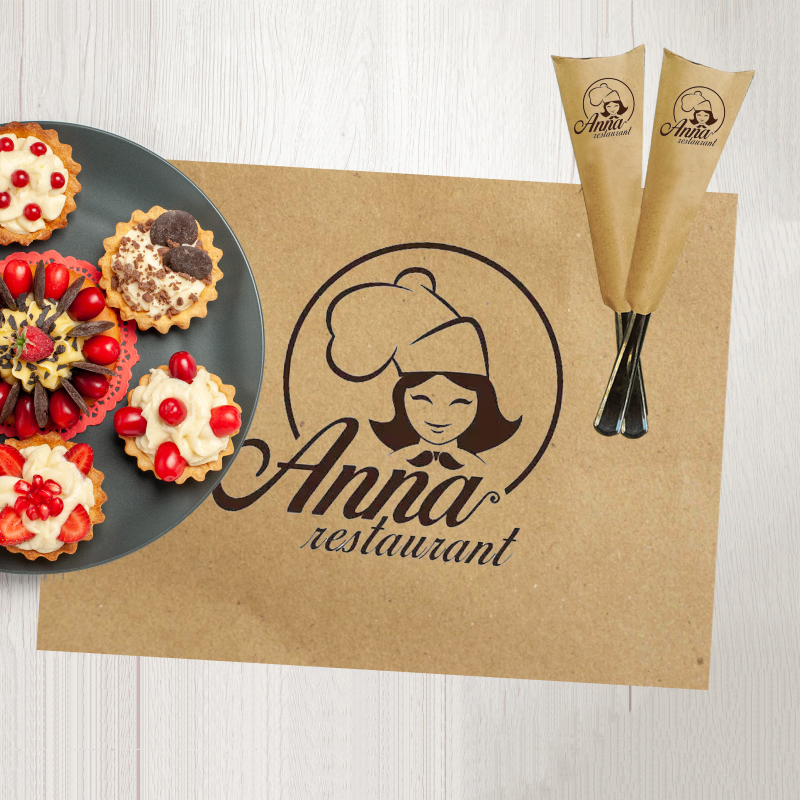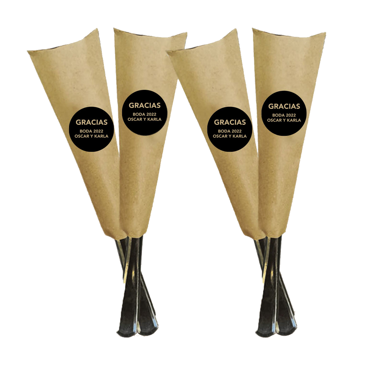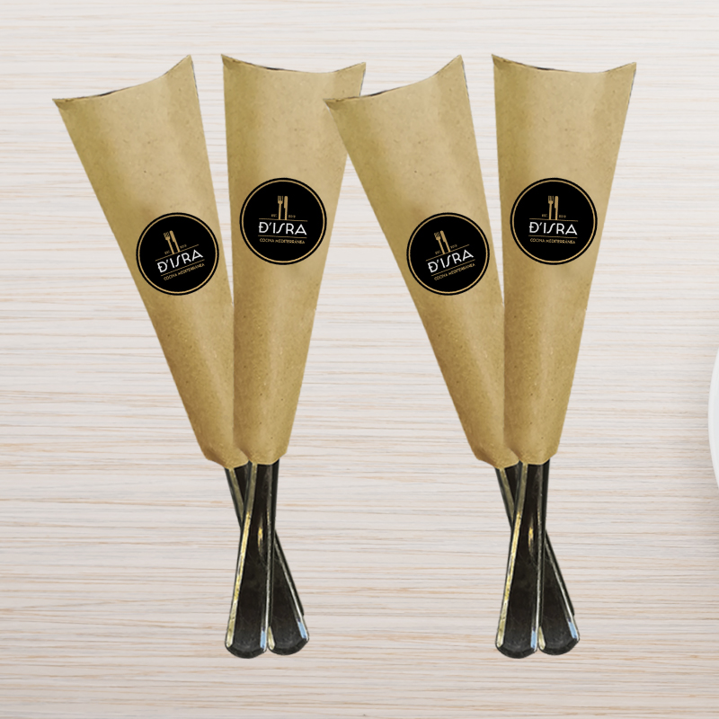 Juego de porta cubiertos en papel craft con impresión full color digital personalizada, impresiona a tus clientes colocando tu marca en cada detalle. Precios incluye IVA.