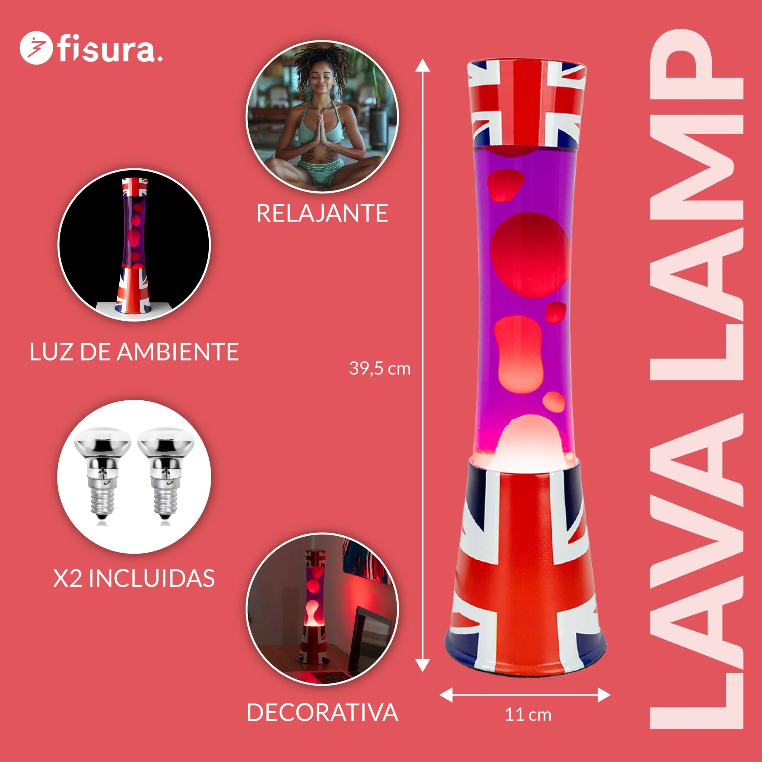 Con un tamaño de 39,5 cm de alto esta lámpara retro es ideal para ponerla en el salón 🛋️, la habitación, el recibidor e incluso en la oficina. ¡Enciéndela y disfruta de las relajantes formas que crea la lava al fluir!