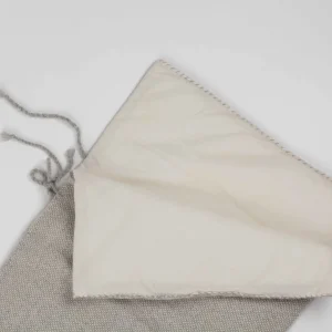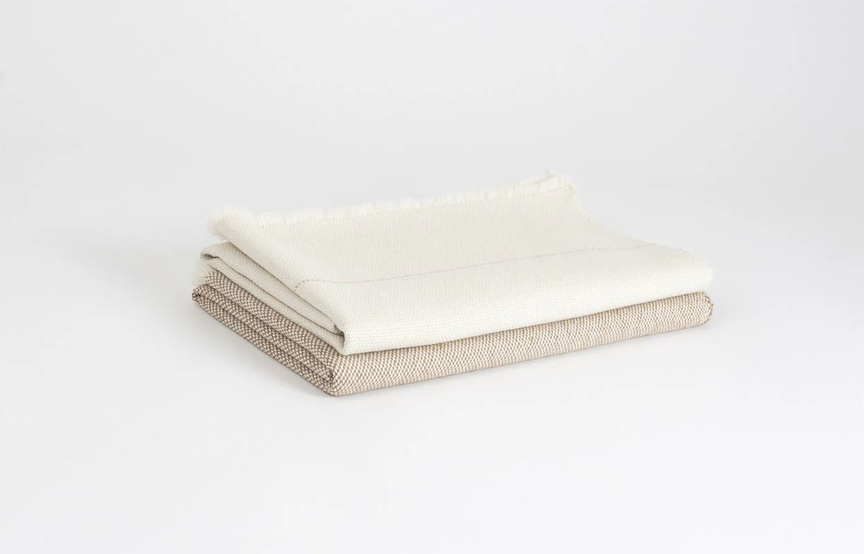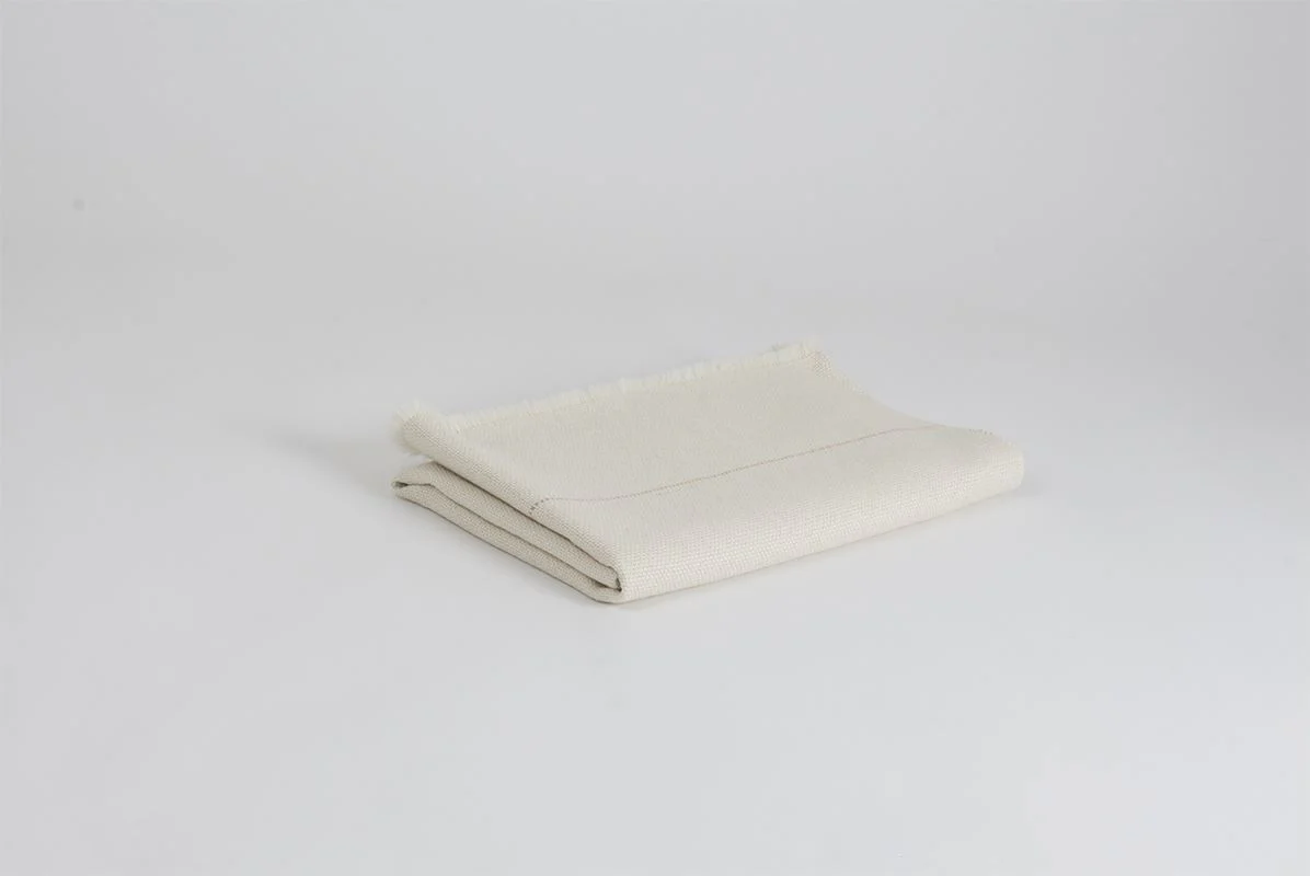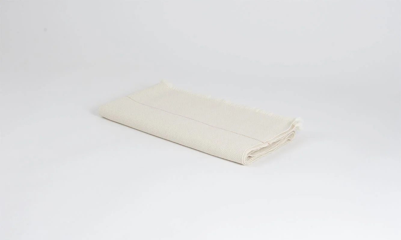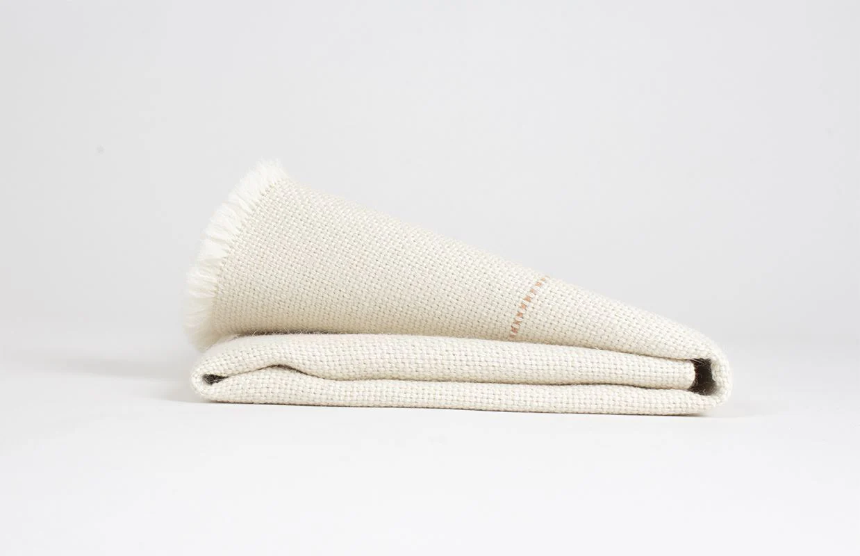 Pieza exclusiva elaborada de manera artesanal, con fibras naturales de primera calidad. Manta pequeña en urdimbre y trama de alpaca baby con seda blanca. Detalle de raya fina color rosa salmón.